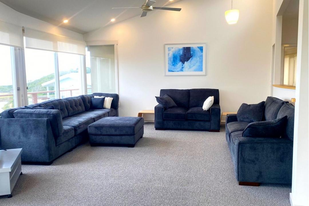 Inside, this spacious four-bedroom home comfortably accommodates up to 16 guests, with three queen bedrooms and a bunk room with four single beds. The modern kitchen is fully equipped, with a full-size fridge, stove, oven, microwave and dishwasher. There's a large open-plan living area that flows to the deck, plus a games room with a pool table. The three bathrooms include a luxurious double-vanity room with twin showers and a spa bath, ensuring comfort for all. split-system air-conditioning, under-floor heating in the downstairs bathroom, and a laundry with a washer and dryer add to the ease of your stay.