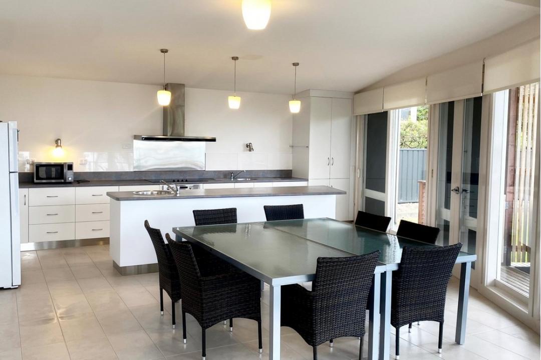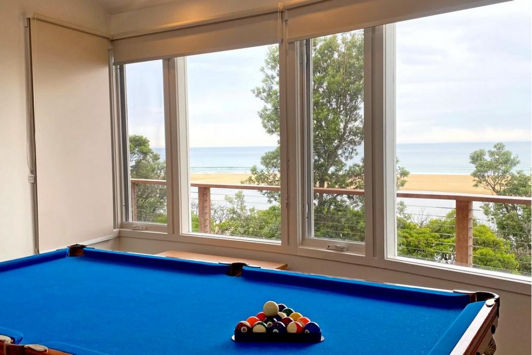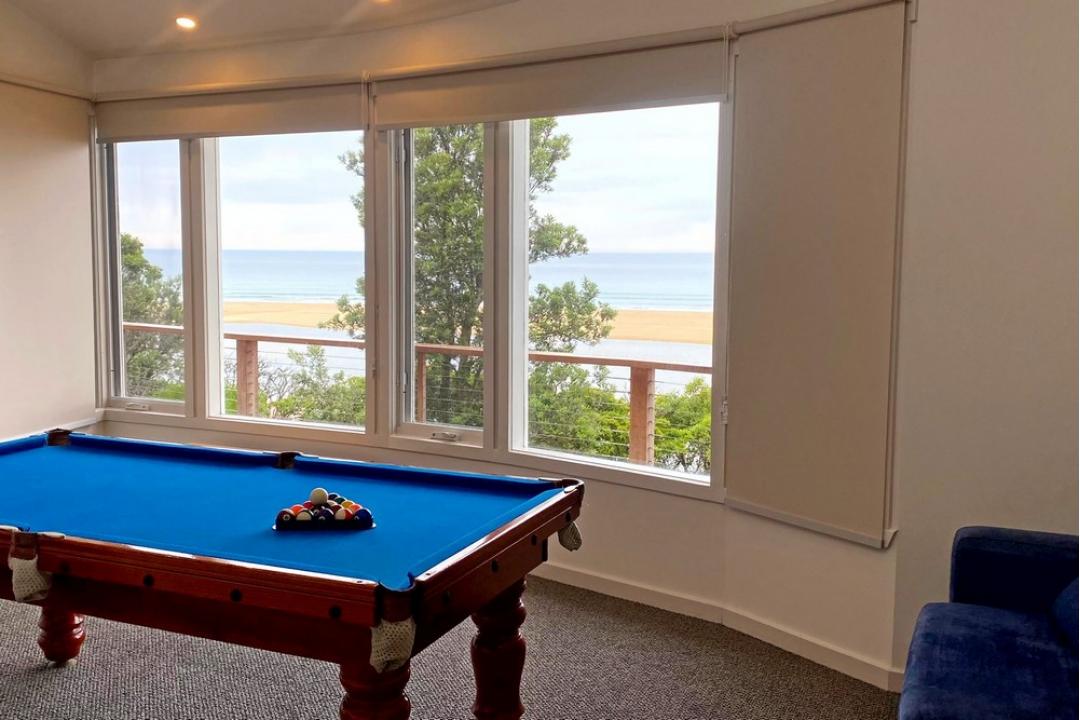 Inside, this spacious four-bedroom home comfortably accommodates up to 16 guests, with three queen bedrooms and a bunk room with four single beds. The modern kitchen is fully equipped, with a full-size fridge, stove, oven, microwave and dishwasher. There's a large open-plan living area that flows to the deck, plus a games room with a pool table. The three bathrooms include a luxurious double-vanity room with twin showers and a spa bath, ensuring comfort for all. split-system air-conditioning, under-floor heating in the downstairs bathroom, and a laundry with a washer and dryer add to the ease of your stay.